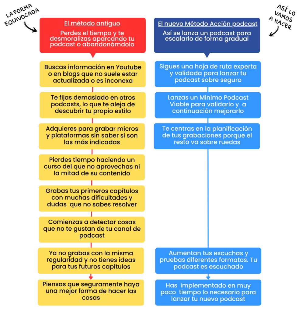 A través de un sistema probado, muy sencillo y rápido de implementar para que lances tu podcast sin complejidades técnicas y con una práctica hoja de ruta.